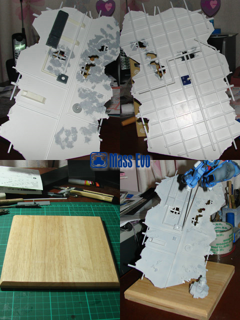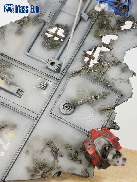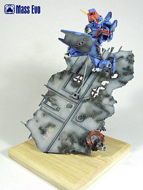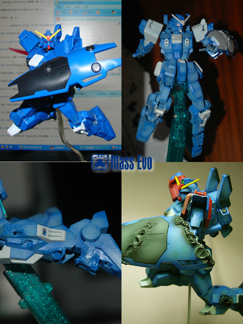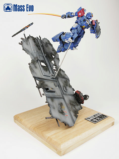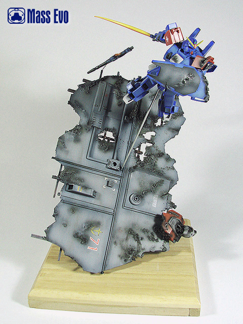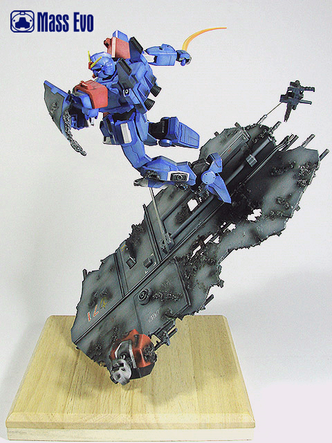 姿势参考了夏元雅人的漫画造型,主体上做出战损的效果。由于机体基本是蓝色为主,所以在喷涂上做出色差。底座用胶板制成,用打磨机做出战损,最后又用了一只HGUC的GM做残骸。(这是第几只呢?哈) |