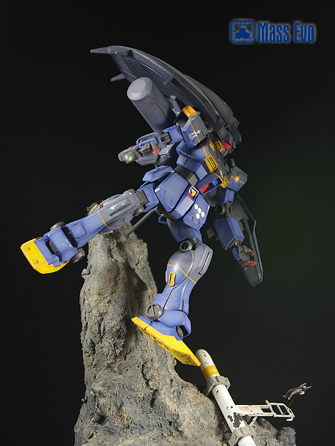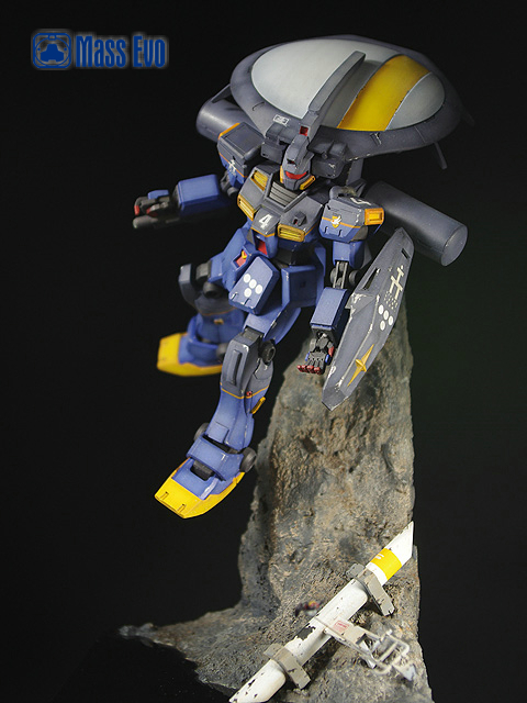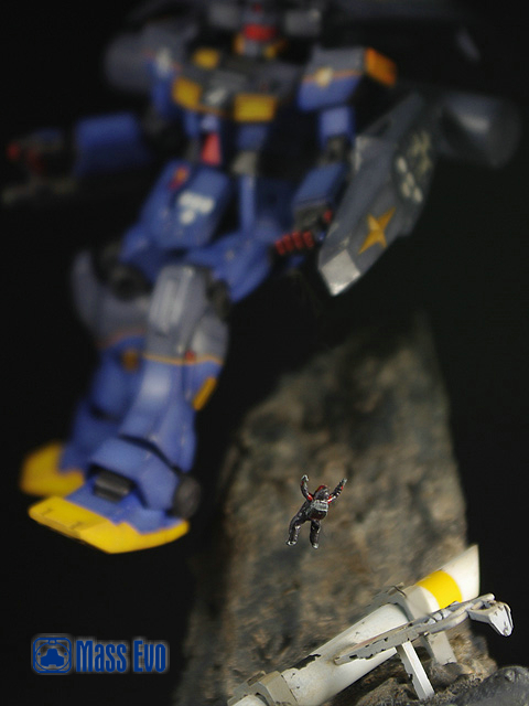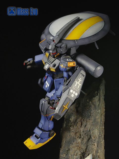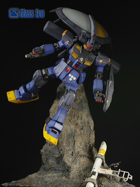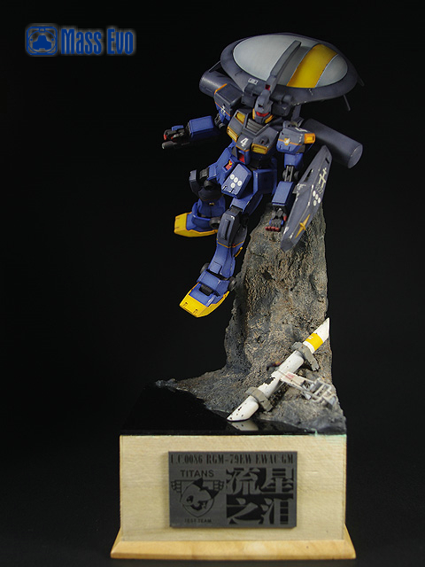 在改造本体上选择了新发售的HGUC RGM-79C,无论在外形设定和可动分件,都是相当出色的一款原型。而作为最大特色的头部圆盘、背包和盾牌部分则来自于HGUC RMS-119 EWAC Zack。制作上首先将圆盘与HI ZACK头部相连的部分切开,然后与GMC的头部比较后定位。GMEW在圆盘之上还有一个长条状感应器,由胶板自制出来,头部两侧同样方法制作出方形的电子设备。最后调整了GM头部顶端的摄像头外形,让整体更为和谐。身体部分主要是在身体右边开槽制作了风口,左边制作了摄像头位置。双腿的小腿根据设定修改了膝盖的造型,用市售的补品加强了动作制御喷口。小腿后侧GMC的造型与RGM-79CR还是有较大的不同,所以用AB土重新制作了外形。GMC的脚板过于圆润,缺少AOZ设定中的硬朗,这边特别要感谢模友3B提供的由其修改翻制的脚板零件。武器根据设定由胶板自制,盾牌则修改了内部与手臂的连接部分。 场景主要表现GMEW搜索到失踪机师的瞬间。构思上主要为表现出空间的失重感。所以尽量将整个作品的重心拉高。采用绿石膏雕出陨石表面的质感,用过去多余的零件制作了陨石外人为的外设。等待营救的小人才用铜线做骨架,AB土雕刻的方式做作。陨石的上色方面采用洗+扫的手法,让陨石的纹理和岩石感加强。 |
