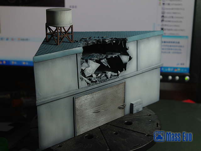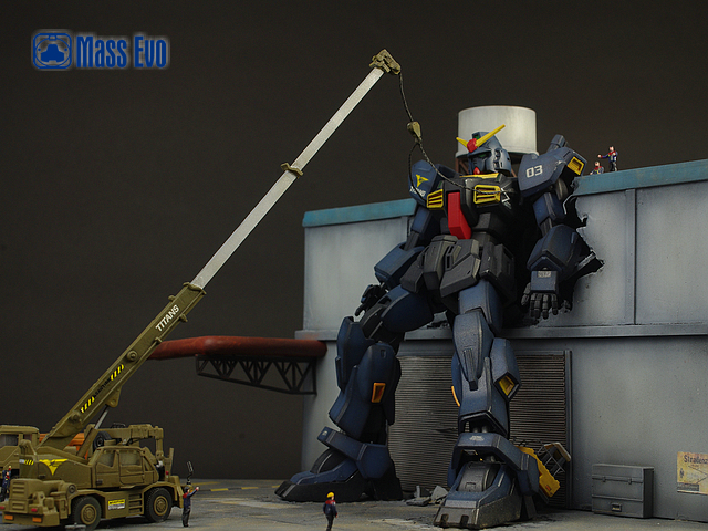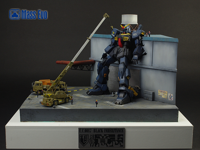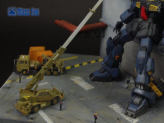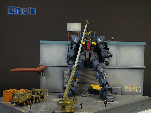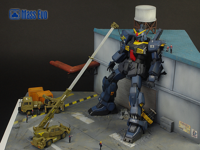 本次制作的场景灵感源于Z高达动画之初的剧情画面,巨大的MKII坠落在卫星内部的建筑上,机体比例与房屋人物间的反差带来的冲击感。本次的制作在材料上选择了HGUC的黑色MKII。最为相对较旧的HGUC套件,关节和身材比例上都不如近期发售的新版套件。由于本次注重的是表现场景,所以在机体的制作上基本保持OOB的风格直做,仅对前臂进行了加长处理。虽然套件的可动性稍显不足,但通过更换手型和调整姿势依然可以做出坠落后的无力状态。在模型的涂装上采用郡士油性漆喷涂,机体在完成主色后喷了高光增强可看性。由于是作为试验机,所以整体只做了轻微旧化。 场景的制作设定为一座TITANS的基地内,实验机坠落后TITANS人员对其进行回收的画面。房屋采用胶板线搭出仓库的轮廓,后用胶板制出外墙。屋顶使用方格板,并在屋顶上加装了水塔增加细节。墙面上用条纹板制作出卷帘门,之后根据场景需要进行细节的调整配合叉车的放置。底座使用绿石膏,根据需要将地台切割划分区域。为增加整体画面的丰富,增加了N比例铁道模型的3台特种工程车辆和同比例的人物。工程车中的吊车修改了吊臂,用胶棒自制了吊臂完全打开的状态,使用细钢缆做出了吊索。叉车选用较为明亮的黄色涂装,增加整个场景的色彩对比。所有的车辆都贴上了TITANS的徽章水贴。人物的涂装根据TITANS的设定采用手涂。当所有完成后根据事先的设计将所有元素安放到合适位置。在MKII双足落地的地方雕出被巨大重量压裂的地面,撒上碎石膏块表现仓库被毁坏后的杂乱。地面采用天然土做适当的修饰,并自制了刻有车轮印的滚轮沾上开稀的油画色在路面上压出轮印。最后自己使用PS制作了2张小海报贴在仓库的墙面上增加可看性。