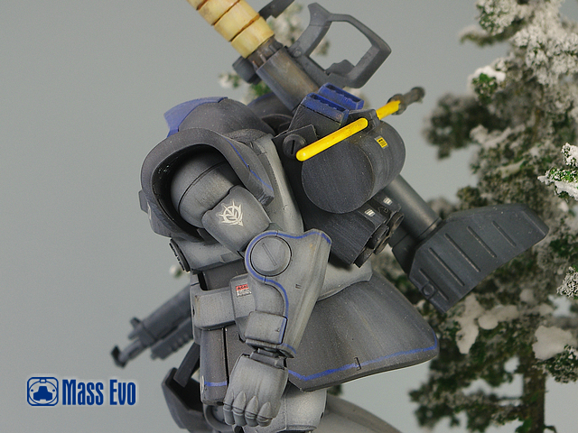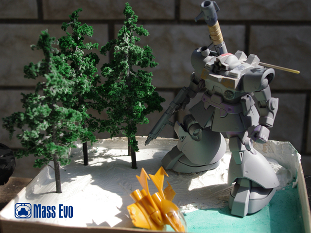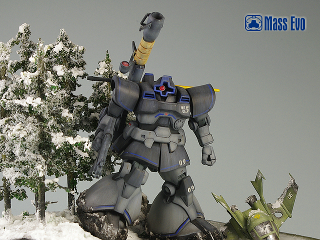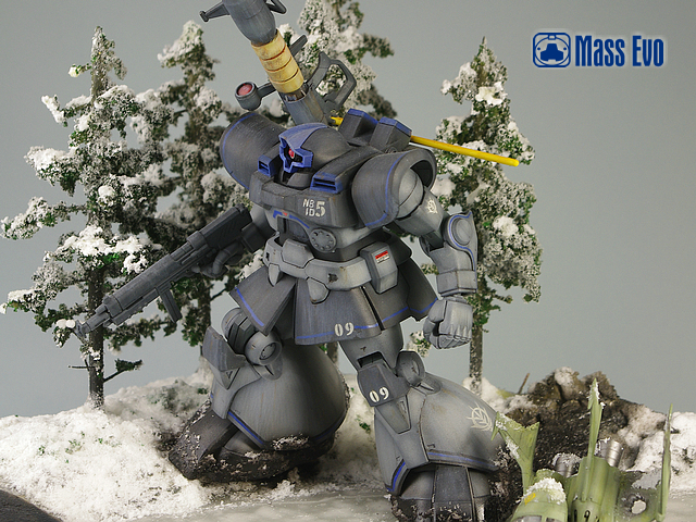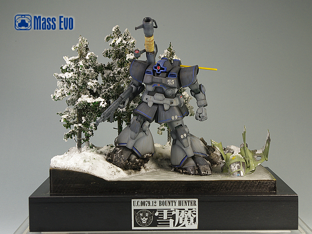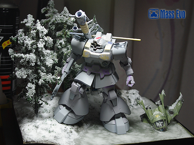 本次的制作主体采用HGUC的DOM,从套件本身来说,可以说完美的表现出了DOM的厚重感和圆润体形。所以改造主要是针对设定中该机体与DOM本身的差异进行的。对于本身的躯干部分,主要用AB土加厚了胸前的附加装甲,封闭了胸部左下的光束扩散炮,并且采用手钻钻孔胶丝植入的方法制作了柳丁。肩膀部分的风口采用胶板制作细节。裙甲部分主要为刻线和挖槽,工作量相对较小。本次制作上最主要也是该DOM最特别的地方就是背包。背包主体的桶装采用PVC管切割而成,其余部分由胶板自制,喷口则采用市售的补品。武器方面,该机体主要采用DOM的标准火箭炮。不过原画中对于武器的炮身做有保温套的设定,所以在制作中使用了AB土制作。此外值得一提的是由于大河原邦男老师的画风给人厚重敦实的感觉,所以笔者将火箭炮的长度适当缩短,加之保温套的制作,使武器给人以粗重的感受。上色方面寒地式样DOM主要由黑色和灰色组成,加以少量蓝色细节的修饰。不过在制作时本人并未直接使用黑色,而是用郡士的40号德国灰来制作。微微透出蓝色的德国灰,使整个机体的色调变冷,也为之后的场景做了铺垫。主体颜色喷涂完成后采用白色和棕色油画颜料做了滤镜和责洗。使层次感有所加强。 本次为了迎合主体,所以将场景设定在有着寒冷冰湖与积雪森林的北美极圈附近。树采用一次性筷子和细树枝做出主体,然后撒上了海绵碎制作树叶。考虑到冰湖会比较单调,所以增加了一架DOPP战机的残骸。战机为EX的卡尔玛专用DOPP,细节刻画一流,作为场景配角绝对一流。地台主要使用石膏浇筑出地形落差,冰湖则用石蜡加热融化后分4次确保层次感的前提下注入完成。从完成的效果来看还是比较让人满意。在大魔行驶过的地方做出融化的雪痕和底下的黑土。黑土在喷完黑褐色后手涂了光油,制造湿润的感觉,并加入一些折断的细树枝。最后在所有地面部分刷上白胶,散上WOODLAND的雪粉大功告成。