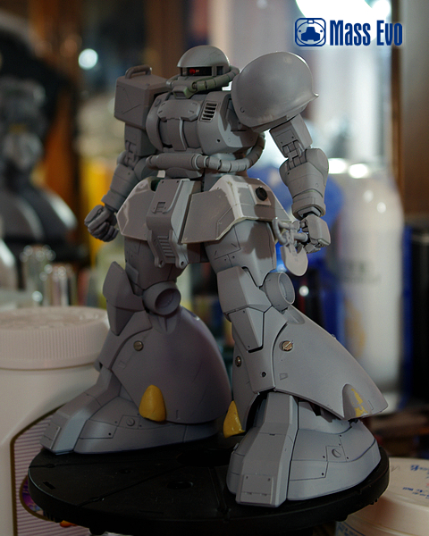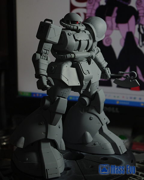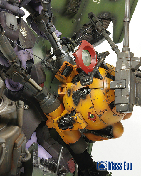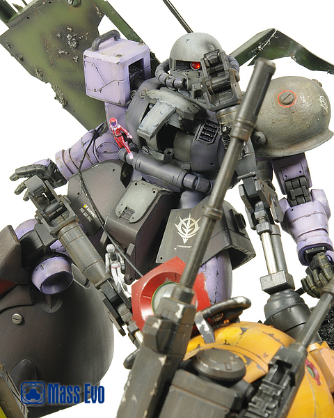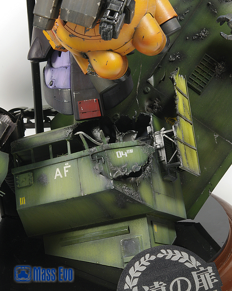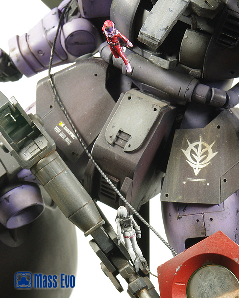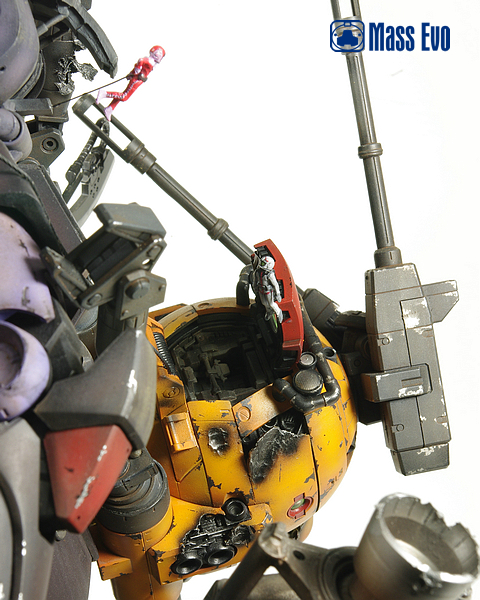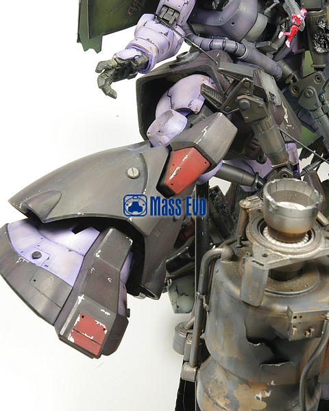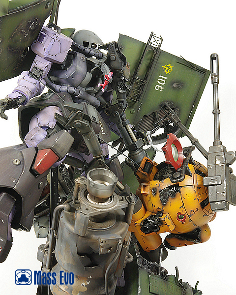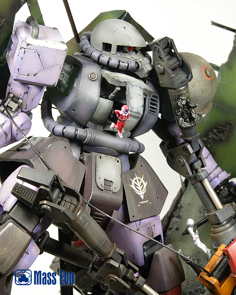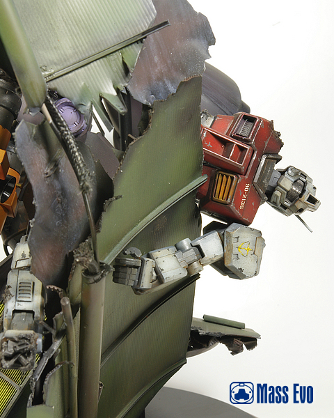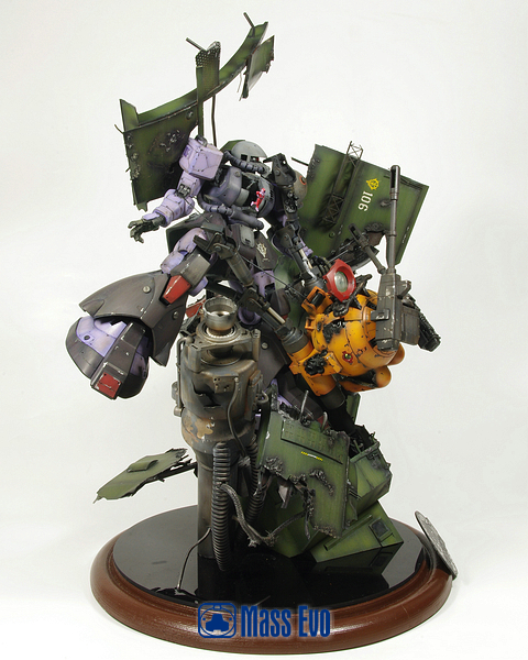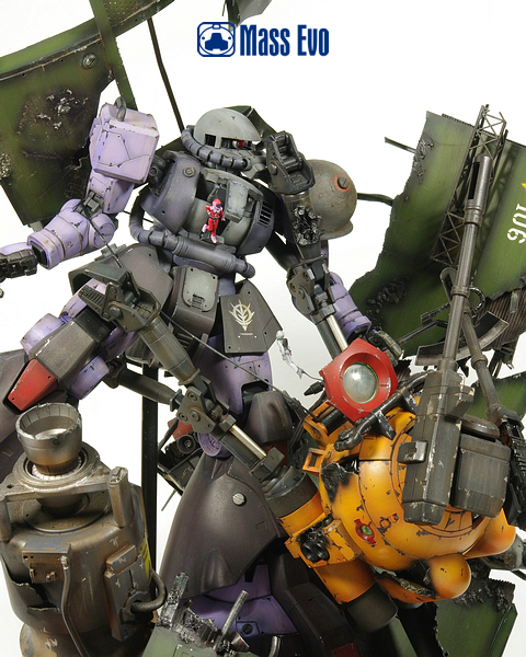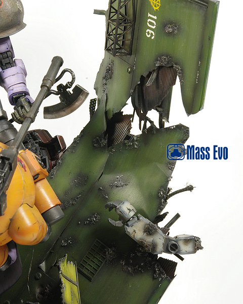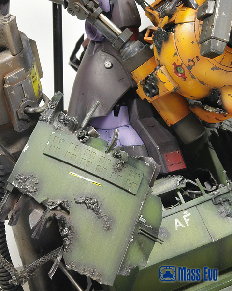 场景分为几大块部分组成,艾娜驾驶的MS-06RD-4高机动试验型扎古、西罗驾驶的RB-79K、RGM-79[E]先行量产型吉姆的残骸、姆萨级的战舰外甲残骸和发动机碎块和麦哲伦级的舰桥残骸。在确定了制作方向后就开始具体的行动。 ■MS-06RD-4没有现成的套件可用,但根据设定决定使用MG的2.0扎古和MG的大魔为基础改造。首先要将两者上下能够连接起来,说到此处不得不承认HG的通用关节在此时就相当的方便。而MG由于更为精密的内构和2.0扎古特有的新关节,所以不得已只能完全自制胯部。同时原有大魔的裆部过窄,在没有全裙甲包裹的状态下会美感全无,所以自制时特别加宽了裆部。机体的裙甲使用胶版搭出大型后,以AB土再进行塑形。肩膀部分为了增强整体的厚重感,将双肩扩大,方肩处以贴胶版的方式增加肩部,后磨出C面。而肩甲处则使用十字增大法将整个弧形肩甲增大后打磨。手腕部分也根据设定形象进行了修改,增加了类似于手镯造型的腕部机构。小腿外甲处使用AB土制作出4个辅助喷口的造型。由于设定图年代久远,机体几乎没有太多的细节,所以决定自行重新设计细节,参考了不少同类作品后,对机体全身进行了刻线和钻孔,配合各类补品使整体造型更为饱满。在喷完水补检查细节后开始上色,上色基本按照设定的配色,各部分通过喷高光来增强立体感。渍洗后,使用白、棕、黑三种颜色的油画颜料,对机体全身做滤镜,在各凹凸处适当的用银色干扫,刻线和细节位置用黑铁色和银色手绘掉漆。由于是宇宙机体所以不存在流锈的问题,因此旧化做到掉漆基本结束。 ■RB-79K使用的是现成的MG套件,不过为了表现战斗中的损坏,所以在多处外甲上使用电磨和手钻等工具做出战损,使用平时做模型多余的蚀刻片对驾驶舱进行细节的追加。上色也是以高光喷涂为主要手法,这种手法的效果和MAX差不多,但整体色彩会亮许多,而旧化渍洗等工序恰恰会使模型整体的亮度降低许多,所以高光喷涂的手法可以为之后的工序在亮度做出一定的提前调整。旧化和MS-06RD-4的手法基本相同,不同的是铁球还有一部分的战损制作,调小喷笔的出气量,在战损位置不均匀的喷涂黑色。之后使用硬毛的排笔沾取少量银色油漆,在废纸上反复蹭扫,直至纸上扫不出颜色,后在战损位置扫除棱角和边缘的质感,做出灼烧后的感觉。 ■RGM-79[E]先行量产型吉姆直接使用了MG的RGM-79[E]C的套件。去除下半身后对上半身就行破坏性的战损处理,在需要表现灼烧和融化效果的地方使用田宫的补土就行处理。上色时将原本的配色在调色时适当降低亮度,使该残骸在场景中的存在感降低。旧化手法基本和前2者相似,不过更多的需要使用灼烧的效果。 ■姆萨级战舰发动机。残骸在设计之初先定义了几个部分,发动机的残骸和外装甲家残骸。发动机的残骸使用大口径的PVC管和养乐多空瓶,搭配各种军模的剩余零件制作,完成大型后使用各类电线和管线追加细节。由于是发动机部分,所以在上色时参考了飞机的尾喷和摩托机车的上色,因黑铁色打底,银色罩出高光。后又用金色做出一些细节的渐变。然后使用透明蓝适度的调整色彩细节的变化。完成后使用白色和灰色的油画颜料进行多层多次的滤镜。大大的降低其亮度的同事,也做出金属燃烧后的灰白效果。 ■姆萨级战舰外甲的残骸,全部由胶版切出大型后,进行细部处理,特别是背面结构,使用切割好的弧形胶条打孔,做出龙骨的结构,搭配上条纹版增加细节。另外将铜枝预先做成残骸结构的一部分埋设在其中,为之后的场景固定做好准备。而后对外甲表面进行刻线和小零件的粘贴,达到整体细节丰富的效果。作为场景中主要的背景,这部分的残骸上色上主要以简洁,低可视度为目标,出了大色块上的渐变高光和适度的掉漆灼烧外,没有做太多的细节处理,反而是在残骸的造型上做了较多不同的设定,让观看者在看到作品是不会喧宾夺主的被背景先吸引,同时在细看时有觉得有细节可挖。 ■麦哲伦级的战舰舰桥其实本人在多年前曾经制作过一次,所以略有心得,在翻看了近几年的新设定,已经EX麦哲伦的模型后,画出工图开始制作,原材料依然是各种厚度胶板和过去模型的剩余零件,不过除了在制作外形以外,还要考虑到战损后露出的内部结构,这一块只能通过几张广角的设定图和笔者的想象力来补完。上色方面基本和姆萨级战舰外甲的残骸相同手法,不过对内部细节的上色还是要特别处理一下。 ■在完成了所有各部分的处理后,笔者将之前预先打好的桩位一个个固定在预先制作好的黑色亚克力地台上。黑色亚克力地台对于宇宙场景的表现可以说是有非常好的效果,这点也是笔者在多次的宇宙场景制作经验中感受到的。通过多次的细调场景构图完成了最后的造型。不过其中也有些地方进行了返工,比如扎古的驾驶舱,笔者发现08MS的设定驾驶舱位置位于身体正中,且打开方式也与其他设定不同,为上下咬合结构,因此基于对原作的尊重笔者重制了胸口驾驶舱的开启结构。铁球射出的钢缆笔者也使用1:35战车的钢缆制作。 ■制作的最后一步就是男女主角的人物。这部分艾娜主要选择使用了模型自带的吉翁机师的身体和头部,四肢用AB土捏出。而西罗直接沿用了O.Y.W版的78-2中阿姆罗的人偶,修改了手臂的造型后进行涂装。小人分别在隐蔽位置使用针灸针就行打桩固定,在完成了人物的安