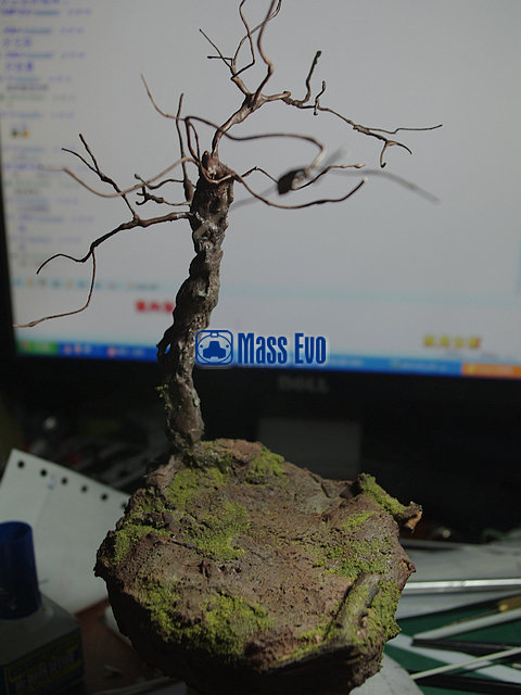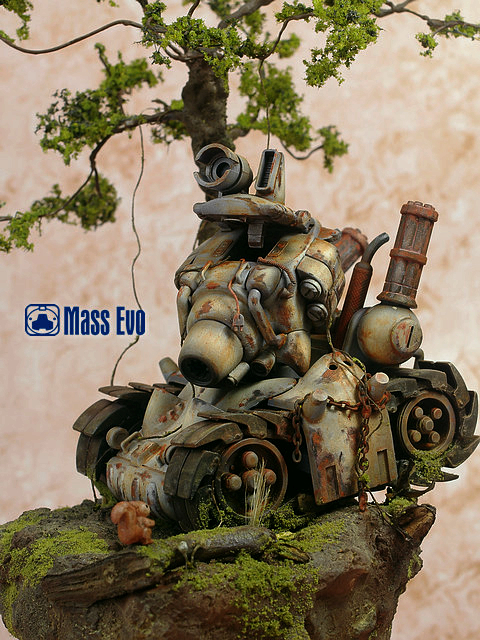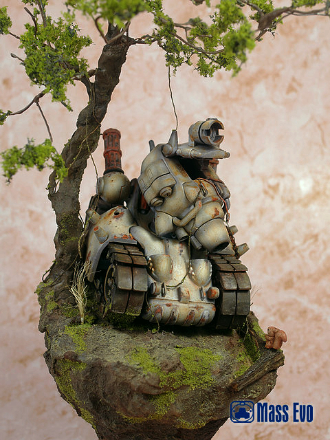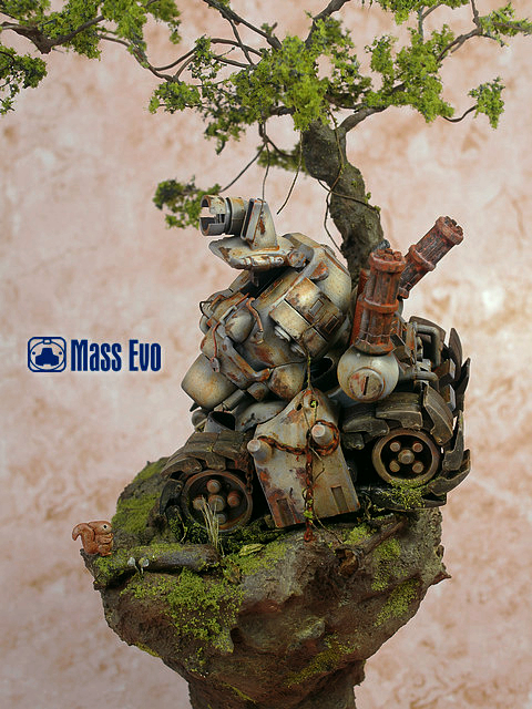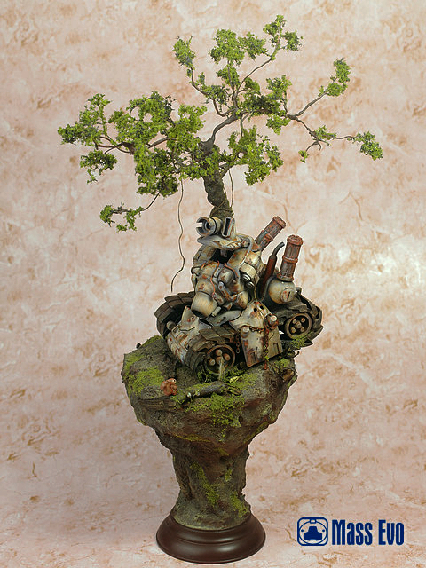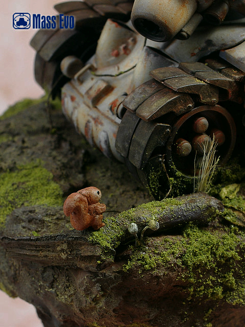 套件到手的第一时间开盒检查,板件错位,变形,毛边数不胜数,当时心就凉了一截。假组后更是发现该套件几乎无组合度可言,更夸张的是对于流缝胶的完全免疫,其塑料大有当年脸盆厂盗田宫那批件的威猛,最后无奈只能全程502对付。 本次场景的构图上其实也是一次尝试,在有限的平面范围内以拉伸高度来增加作品压迫感。环境设定在曾经作为战场的森林里,一只小松鼠经过一台废弃的坦克,面对庞然大物,这突如其来的邂逅将格格不入的双方碰撞出不一样的火花。 制作中首先进行坦克的组合,发现一个问题,该车炮塔虽有球形关节,但受液压杆的限制,基本没有可动性。为了达到场景中战车的落魄感,选择放弃液压杆增高炮塔基座,使炮塔可以做出炮口低垂的造型。上色上主要以游戏中的灰白色为底色,配合阴影和高光做出立体感。而后使用硝基漆和珐琅漆逐层掉漆。再使用油画色进行多次的渍洗以加强层次。待上述步骤完成后,使用天然土和油画颜料分别做出锈迹和流锈,主体基本完成,履带为配合地台使用多色的天然土进行浮土和淤泥的处理,总体效果较为满意。 底座采用了多年制作场景以来规格最小的一个圆形基座,石膏浇筑出类似倒三角形的地台(被几个朋友笑称为大力神杯形)。并从小区的花坛里选取了几块枯枝点缀,采用郡士的硝基漆喷涂,天然土湿扫,最后在一些部分撒上WOODLAND草粉以白胶固定。关于场景中的树,在整体的构图角度来说,如果底座构成了场景的下半部分,那树就是整个场景的天。其实关于树木的制作也一直困扰笔者多年,本次的制作采用以铜线为主体拗出造型后,将粘土石粉铺在主杆表面的手法,在以铜线为主体的树枝上粘上WOODLAND的小块状海绵。全程非常考验耐心,不过总体效果还是让笔者较为满意的。场景中为了营造气氛,在坦克和树上都制作了一些藤蔓,采用剪成细条的纸巾,沾上混合过白胶的水后搓成一条条,干后以田宫水性漆上色。完全所有以上步骤以后,最后制作的是场景中的另一主角——松鼠。由于找不到现成的套件,所以最后采用AB土自制。考虑到坦克的Q版风格,松鼠也制作成圆润的造型,上色后固定在场景之中