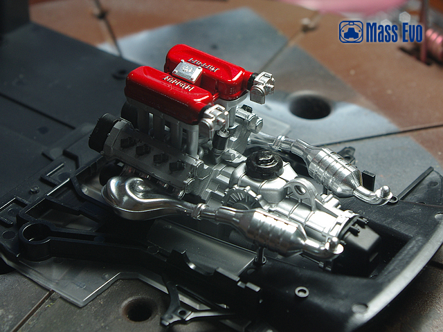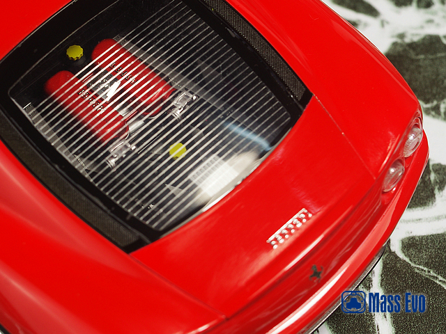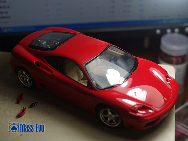 本次制作难点主要是发动机和车壳。发动机的上色翻阅了不少实车资料,根据照片按部就班,发动机的红色部分采用制作伪电镀的手法:黑—银—透明红的上色过程来喷涂。本次车壳第一次尝试了镜面的效果。首先全身打磨车壳使用砂纸#1000——#1500——#2000,盖亚的白色喷涂全身打底,郡士的意大利红做底色,盖亚光油全身喷涂8次。烤漆箱内35°烘烤一周后开始打磨抛光,流程依次为:#2000砂纸——粗目打磨膏——细目打磨膏——最上目打磨膏。待全部完成后全车上了田宫水蜡。 |