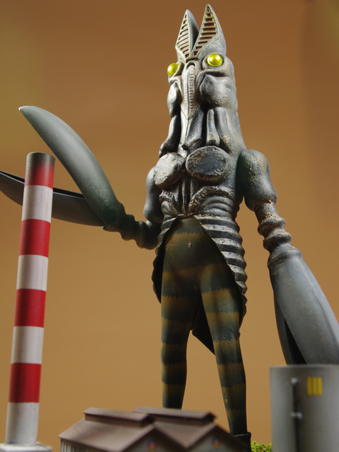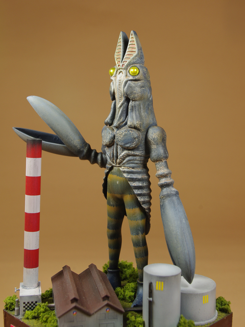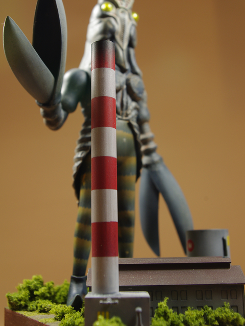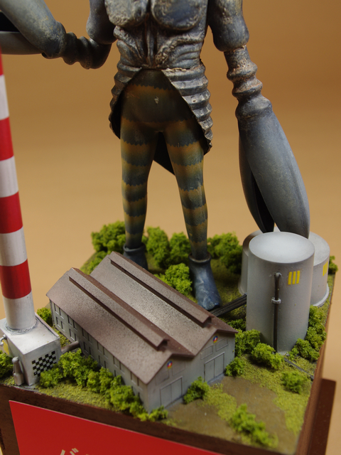 套件本身基本就是植物人的水准,造型刻画比较中规中矩,不过由于当时的开模技术组合度和细节相对比较差。套件本身是第二巴尔坦星人,出场于1966年10月30日的初代奥特曼第16话(科特队向宇宙进发)。剧中场景充满浓郁的昭和风,所以在作品制作之初就将作品的风格定位怀旧、复古的昭和风格。 本次的地台制作在反复观摩了数十集奥特曼后决定以工业区为背景,展现巴尔坦星人出现的一刻。较大的油罐来自于1:700的水线码头套件。较小的一个则直接使用胶管+胶板自制。厂房同样来自于上述所提到的套件,而烟囱则使用较细的胶管制作。各部分之间的管道使用流道加热拉丝。上色基本中规中矩,最后用天然土湿涂的方式对地面进行上色,干后用草粉和灌木丛点缀。 |