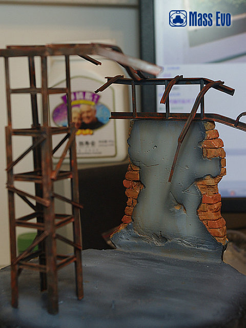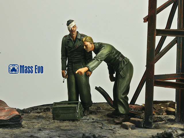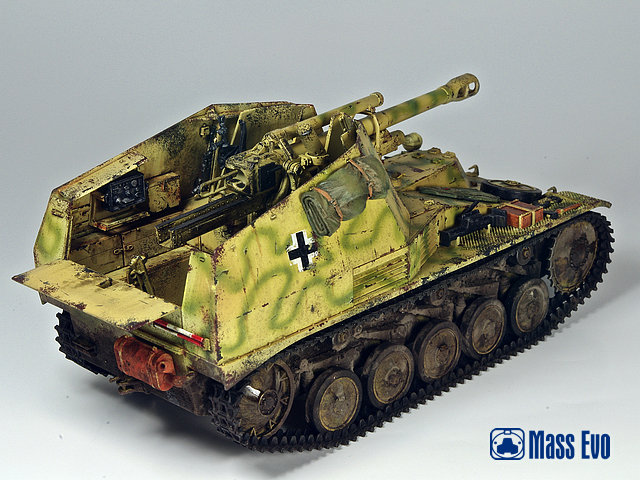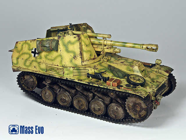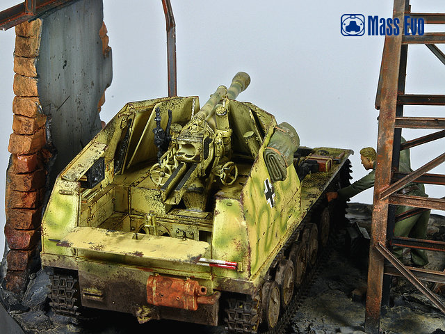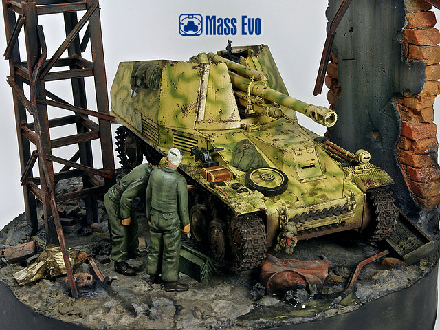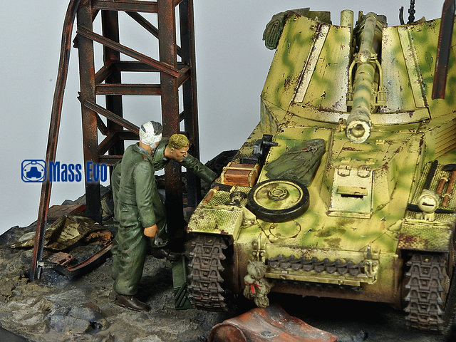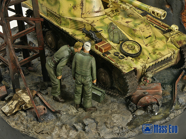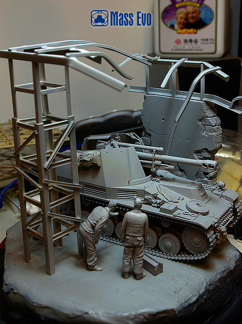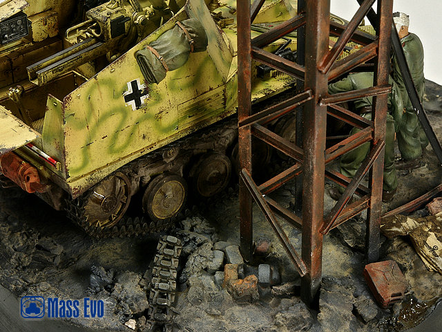 田宫的35200蜜蜂自走炮。虽然已经是年代久远的老套件,但丝毫不影响其优秀的组合和简约的零件设计。相比近年来龙和号手不断的追求高细节多分件,田宫仍然沿袭着自己对精密细节和零件数量之间的平衡。愉悦的素组之后即开始上色,星影的水补土打底,试用下来水补土较郡士的同类产品较为粘稠,需多加溶剂,干透后附着力尚可。车体以星影的80% J-39暗黄色+20% J-62消光白调出基本色,绿色的迷彩条纹则以30% J-39暗黄色+70% J303绿色调出。总体试用下来感觉星影油漆的浓度较一般常用的硝基漆来的浓,所以稀释比例也有所不同,需要使用前先熟悉一下。不过该漆也有优点,遮盖力相当的强悍,原本遮盖力最弱的黄色使用起来也相当的舒服。而漆面干燥后的附着力相当惊人,对于喜欢旧化的朋友来说可以说是相当爽的一件事。 基本色完成之后即开始旧化处理,车体掉漆使用海绵掉漆法和面相笔手绘搭配的方式绘制。海绵掉漆主要使用红褐色和黑铁色,而手绘则使用黑铁色和之前调好的车体黄增加白色百分比后的高光色做出双层掉漆。之后油画色进行全车渍洗,搭配AK的各种表现液做出污迹和油渍,车体的行走部分搭配天然土和油画颜料做出层次。 ■场景制作 场景设定为在一个工厂的废墟中,车组成员检修自走炮的托带轮。厂房的钢结构使用工字胶版和L型胶版混合搭出,墙面则使用石膏浇出石膏板后用刻刀刻成。为了丰富场景的细节加入了弹药箱,油桶、油箱等元素。上色使用星影的JXF-69打底配合油画色渍洗,天然土干扫,以水晶滴胶做出地上的积水。场景中的2个人物使用树脂人形换树脂头,以AV漆手绘。最后为了增加场景的趣味性,参照历史照片中德军车体上挂的幸运布娃娃,在车体前面挂上一只熊娃娃点缀。