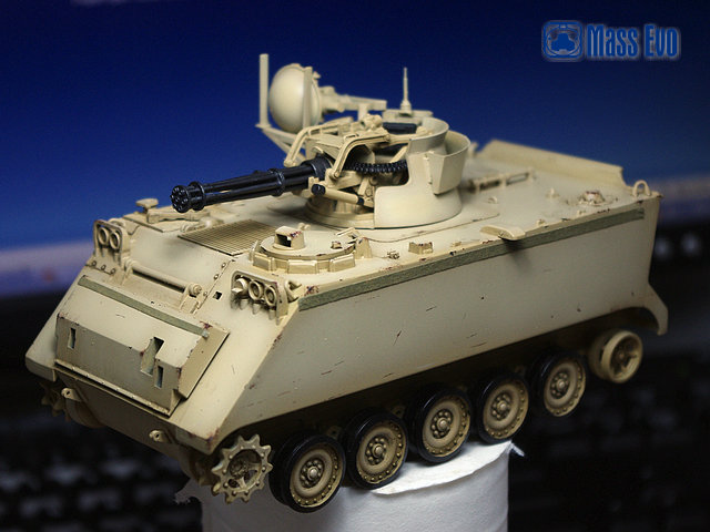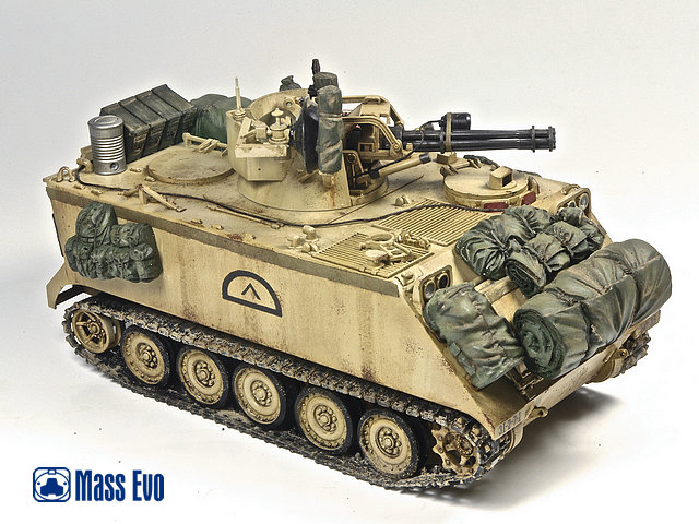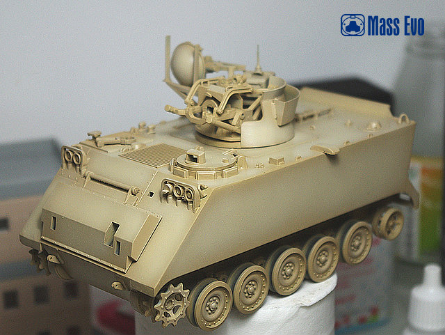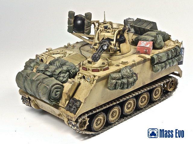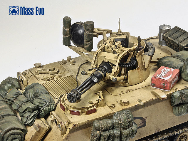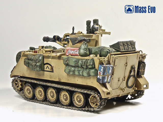 作为代理产品,在品质上的确有较多问题,板件的错位,变形,飞边和极差的组合度,一度让我有放弃的冲动。不过依赖着自己的双手和信念(这两者怎么那么耳熟)最后还是成功完成了素组,之后大量的补土、打磨后,总算车体基本成型。套件里给出的涂装和水贴式样基本是三色迷彩和阿拉伯装备式样,在纠结半天后决定自己考证“沙漠风暴”行动中的涂装。 本次上色继续使用的是龙飞快递来的星影系列油漆。考虑到之后渍洗可能带来降低整体色调的效果,在上底色前适当考虑提前量以J-19沙褐色为基础色,加入J-62消光白,调处较浅的美军沙漠黄,在大面积的空白部分做出高光色差,之后使用浅棕色的油画颜料进行全车渍洗,喷上消光保护后,进行细微的手绘掉漆,现代车辆不会像二战战车那样掉漆严重,所以一定要控制好尺度。在舱门和车顶人员走动较多的位置做出污渍,在邮箱盖出点出适当的油渍。根据模友们提供的战地照片增加一些如管线和辅助光源等细节,同时遮盖出logo,考虑到美军长久以来大包小包的传统,从淘宝上购置大量树脂外挂包,使用JXF-67喷涂后做出褶皱的高光,渍洗后使用天然土处理。最后打印了可乐纸箱,安置在车上完成最后步骤。 这次的整个制作过程基本一气呵成,利用5个工作日的闲暇时间完成。原本计划配一个小地台,但苦于一直懒于下手,最终就这样完成吧。其实本作对笔者来说完成怨念的意义比完成作品更深刻,对于15年前的自己来说或许是一份迟到的快乐吧。 |