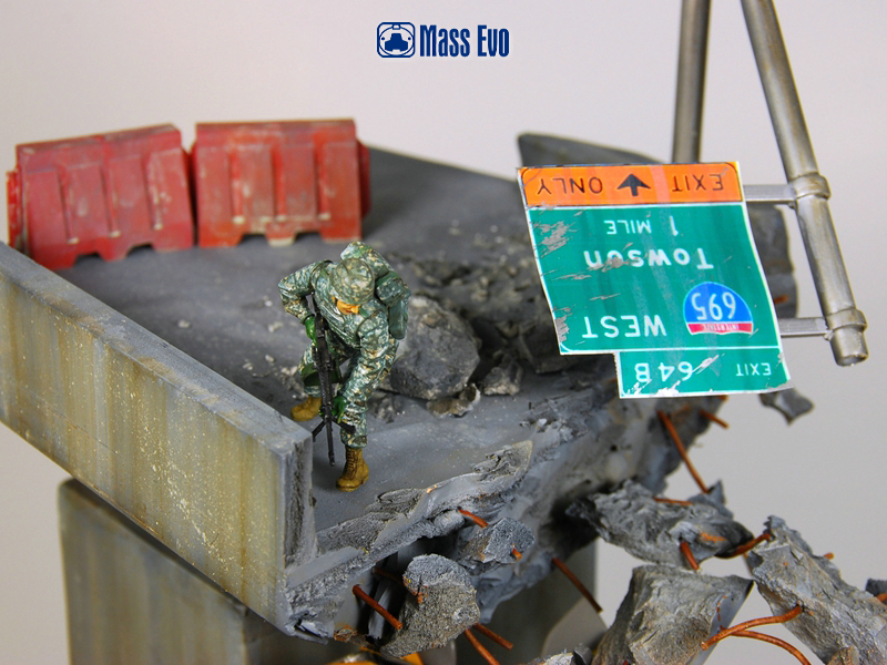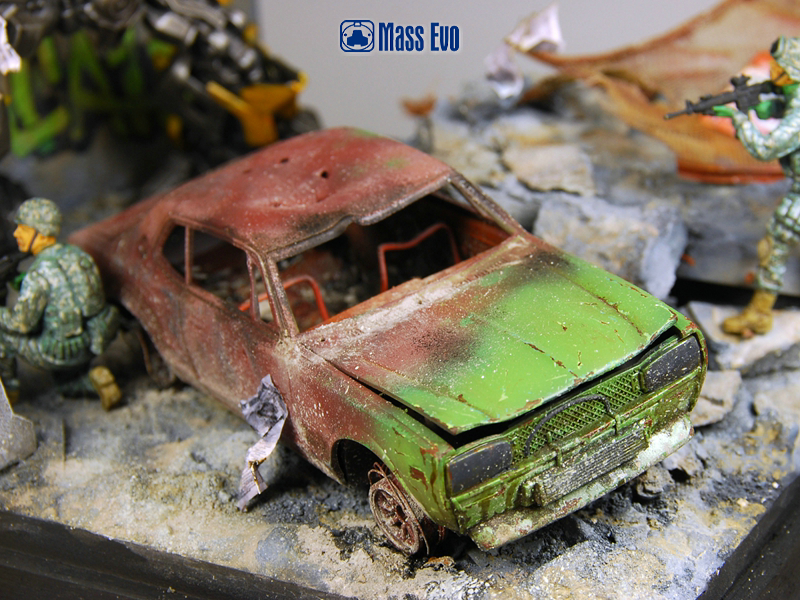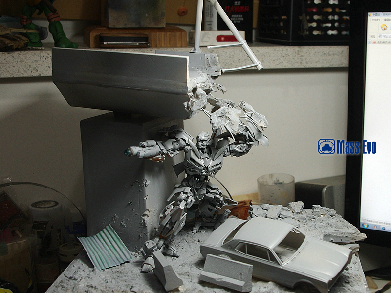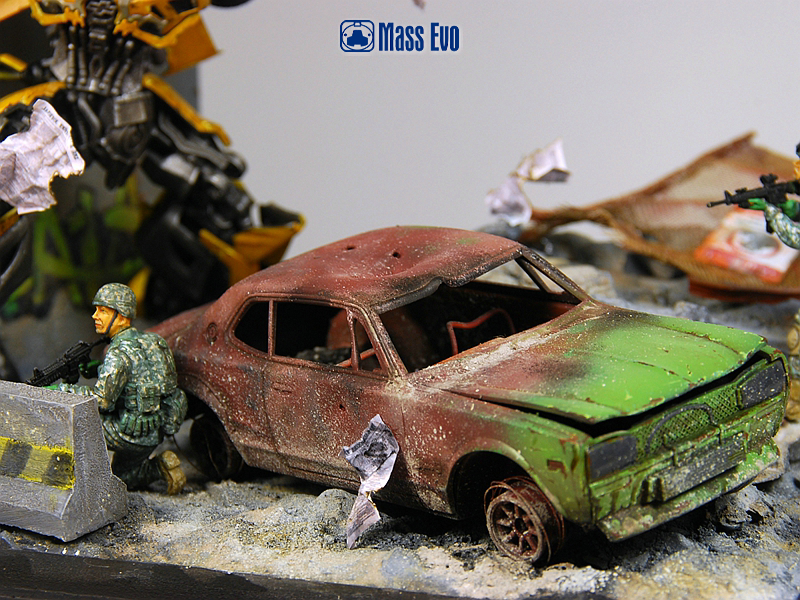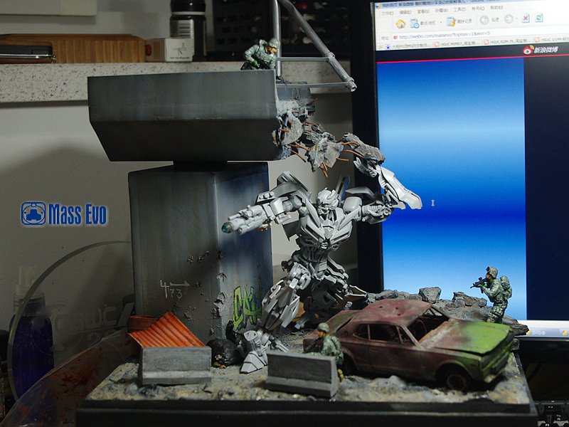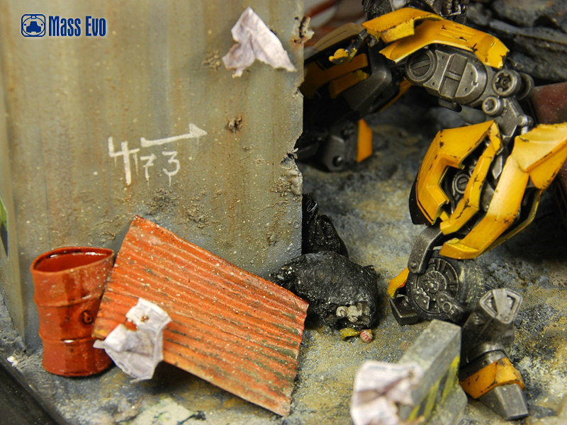 依然是TOMYTARKARA的套件,组合上马马虎虎,且细节有些肉,不过总体造型与电影中的还原度来说还是相当高的,另外可动性较前一作的擎天柱也有提升。在素组完成后笔者将飞骨架部分的外甲重新拆除,开始对可动性上做一定的调整。由于作品本体是激战中的场景,所以对于作品的构图尤为重要,本次制作的地台为20X30CM的矩形底座,场景定位城市街道立交桥的复式结构,所以在一开始就选定了立交桥为最高点,依次递减的三角形构图。完成构图后使用雪弗板和石膏的混合搭配制作出碎石和立交桥部分。之后将场景中出现的元素逐一放入其中搭配设计。包括废弃的轿车,路障,瓦楞板,路牌以及美军士兵。 在完成整体的造型制作后进入上色环节。首先是整个地台以为水性灰色喷涂整个地台,随后在较大的碎石位置做出色差和高光,而立交桥则用相对深一些的灰色喷涂,之后进行滤镜。在立柱下方使用AV漆手绘了街头涂鸦。 场景中的废弃轿车,在上色前笔者搜索了大量被焚毁汽车的照片作为参考,将车体原本的颜色定位绿色,而焚毁部分则以红褐色喷涂底色,之后以AV漆搭配面相笔绘出焚毁车体上的色彩变化,搭配多种颜色的天然土再进行了细部的修饰。而车体内部则用铜丝制作出座椅的骨架,AB土捏出烧化的残留物。参考了真实照片使用0.2的铜丝在轮毂周围做了烧毁后子午线轮胎留下的钢丝。 三名美军士兵选自于田宫最近换盒包装的MB的现代美军组,本想偷懒使用ACU的水贴,但实在效果不佳,无奈只得慢慢手绘。使用的AV漆,色彩自调,不得不提一句,MB的这几个脸似乎都有点长坏的嫌疑,无奈手头没有合适的树脂头替换,所以只能作罢。 作为场景的主角,大黄蜂的上色分两个部分,骨架和外甲。骨架直接使用黑铁色喷涂,后以郡士的#8银适度的扫一下棱角,然后用面向笔手绘出细节部分的银色划痕和磨损。(读者会问,为什么不直接干扫,直接干扫虽然会比较轻松,但变化会过于单调,分布均匀。)而外甲部分笔者先喷完橙黄色主色后,将原本的黑色条纹补齐(这部分不如前一作擎天柱套件来的人性,一大张水贴呢。)然后开始用较浅的黄色慢慢绘制划痕和第一层掉漆,切记掉漆的棱角必须分明,完成后以黑灰色手绘第二层掉漆,使整个外甲边的层次丰富。 完成所有个体部分后加入场景进行后期的修饰,废弃的铁丝网使用金属网加胶条组合制作,海报则直接打印,而立交桥上的路牌从网上选取了合适的素材照片进行打印。并在场景中增加了垃圾袋,废油桶,路障等小物件丰富作品。完成后笔者觉得整个作品仍然缺少电影中的动感,最后决定制作飞舞的报纸将作品表现成瞬间定格。报纸用A4纸双面打印,做完这周处理后,以502固定,作品即告完成。 |